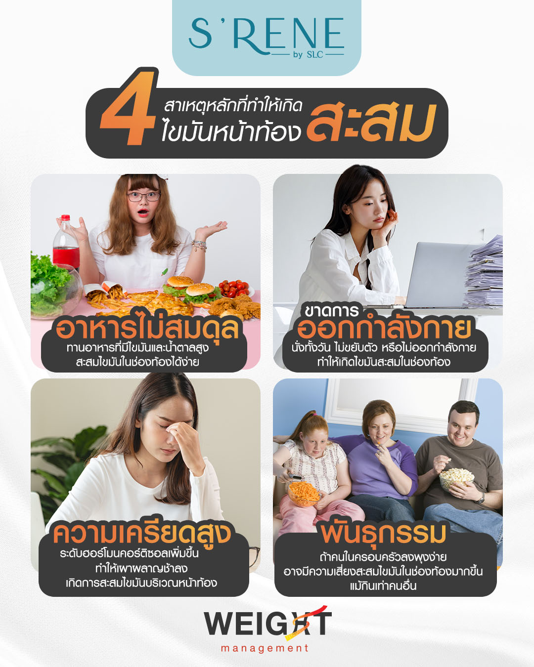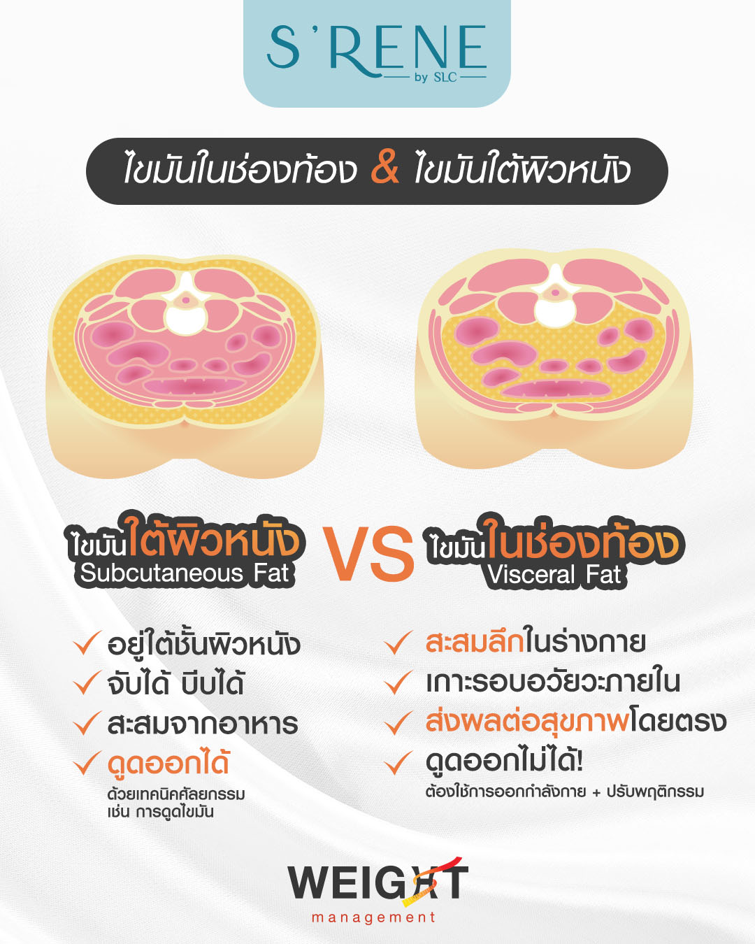 สุดท้ายนี้ ต้องบอกเลยว่าการดูแล ไขมันในช่องท้อง ไม่ใช่แค่เรื่องของรูปร่าง แต่ยังเกี่ยวข้องกับสุขภาพภายในที่สำคัญมาก เช่น โรคเบาหวาน ความดันโลหิตสูง และโรคหัวใจ การเลือกวิธีที่เหมาะสมในการลดไขมันจึงมีความสำคัญ โดยเฉพาะเมื่อ วิธีลดไขมันหน้าท้อง ที่ทำอยู่ยังไม่เห็นผลหรือไม่ตอบโจทย์ หากการควบคุมอาหารและการออกกำลังกายยังไม่ได้ผล การเลือก โปรแกรมช่วยจัดการ ไขมันในช่องท้อง Visceral Fat Care Program ที่ S’RENE by SLC อาจเป็นคำตอบที่น่าสนใจ เพราะไม่เพียงแค่ช่วยลดไขมันในช่องท้องได้อย่างมีประสิทธิภาพด้วยเทคโนโลยี 448KHZ Deep Care แต่ยังช่วยกระชับผิวให้เรียบเนียนขึ้นโดยไม่ต้องผ่าตัดหรือพักฟื้น เพราะแน่นอนว่า สุขภาพดีภายในเริ่มต้นที่การดูแลไขมัน แต่ถ้าปล่อยปัญหานี้ไว้นาน สุขภาพแย่ไม่รู้ด้วยนะ และสำหรับใครที่กำลังมองหาตัวช่วยที่ตอบโจทย์ทุกความต้องการ ก็อย่ารอช้า เข้ามาปรึกษาและพูดคุยกันได้ที่ S’RENE by SLC ได้เลย รับรองว่าเรื่องสุขภาพที่กังวล จะดีขึ้นได้อย่างแน่นอน