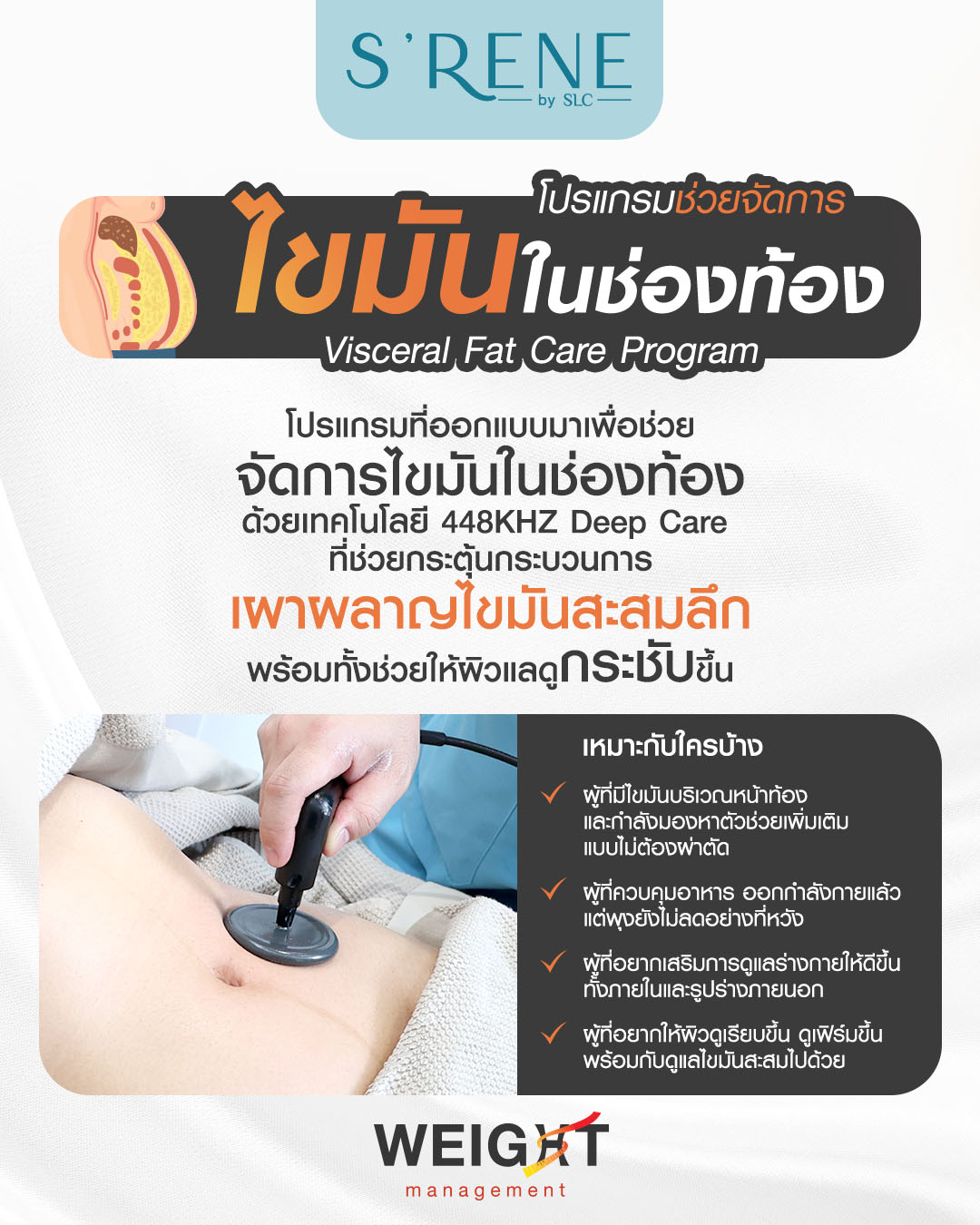 Visceral Fat Care Program ใช้เทคโนโลยี 448KHZ Deep Care ที่กระตุ้นการเผาผลาญไขมันในช่องท้องได้อย่างล้ำลึก โดยไม่ต้องผ่าตัดและไม่ต้องพักฟื้น โปรแกรมนี้ช่วยให้ไขมันในช่องท้องลดลง พร้อมทั้งกระชับผิวให้ดูเรียบเนียนขึ้น ผลลัพธ์ที่ได้