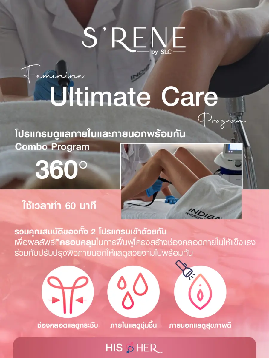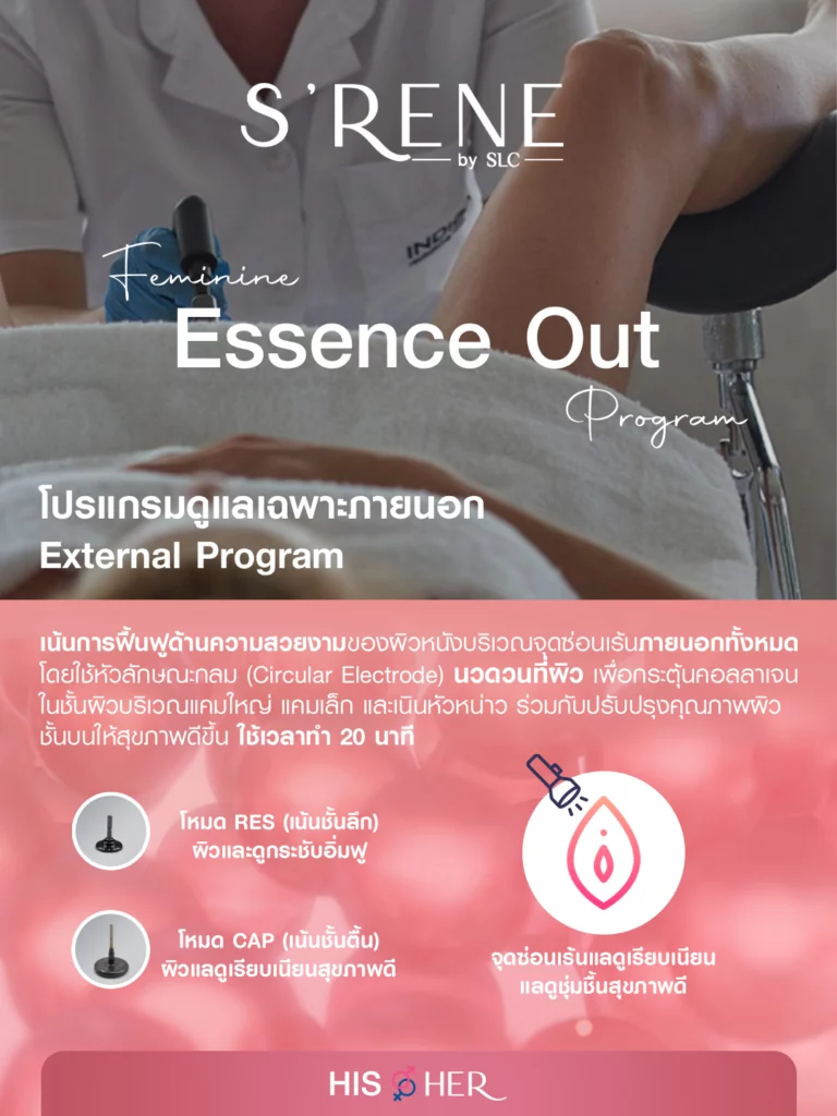 โปรแกรมนี้จะใช้ คลื่นวิทยุแบบขั้วเดียว (Monopolar RF) ความถี่ 448 kHz กระตุ้นการไหลเวียนโลหิต ฟื้นฟูเนื้อเยื่อ เพิ่มความยืดหยุ่น ช่วยปรับสมดุล pH ลดกลิ่นไม่พึงประสงค์ พร้อมทำงานร่วมกับเทคนิคของนักกายภาพบำบัด เพื่อเร่งสร้างคอลลาเจนและเติมความชุ่มชื่น ถ้าเป้าหมายหลักของคุณคือการ “เปิดไฟให้ผิว” แก้ปัญหาความหมองคล้ำโดยเฉพาะ แนะนำเป็นโปรแกรม S’RENE Feminine Essence Out ราคา: 6,900.- / ครั้ง (20 นาที) โปรแกรมนี้จะเน้นการใช้เครื่องช่วยปรับผิวจุดซ่อนเร้นด้านนอกให้กระจ่างใส แต่ถ้าอยากอัปเกรดความมั่นใจแบบครบสูตร ทั้งเรื่องสีผิว ความกระชับ และความชุ่มชื้น อาจจะเลือกเป็น S’RENE Feminine Ultimate Care ราคา: 12,500.- / ครั้ง (60 นาที) ก็เป็นตัวเลือกที่ครอบคลุมกว่า