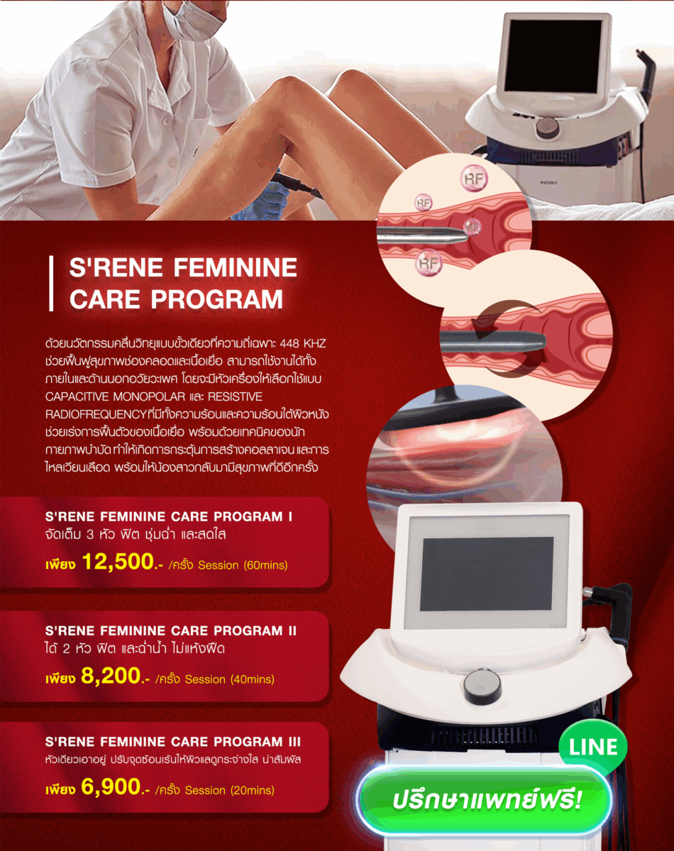 - S’RENE Feminine Care Program (INDIBA) ส่วนรายนี้มาในมาดนักกายภาพบำบัดเซลล์ด้านการฟื้นฟูจากภายในสู่ภายนอก ด้วยการใช้คลื่นความถี่เฉพาะ Monopolar RF 448 kHz เข้าไปปรับสมดุลและกระตุ้นการทำงานลึกถึงระดับเซลล์ ช่วยส่งเสริมการทำงานของเซลล์ ช่วยให้เนื้อเยื่อบริเวณจุดซ่อนเร้นรู้สึกผ่อนคลาย และช่วยเรื่องการไหลเวียนเลือด เหมือนพาน้องสาวไปเข้าสปาเพื่อรีเฟรชและฟื้นฟูสุขภาพแบบ Deep สุด ๆ!