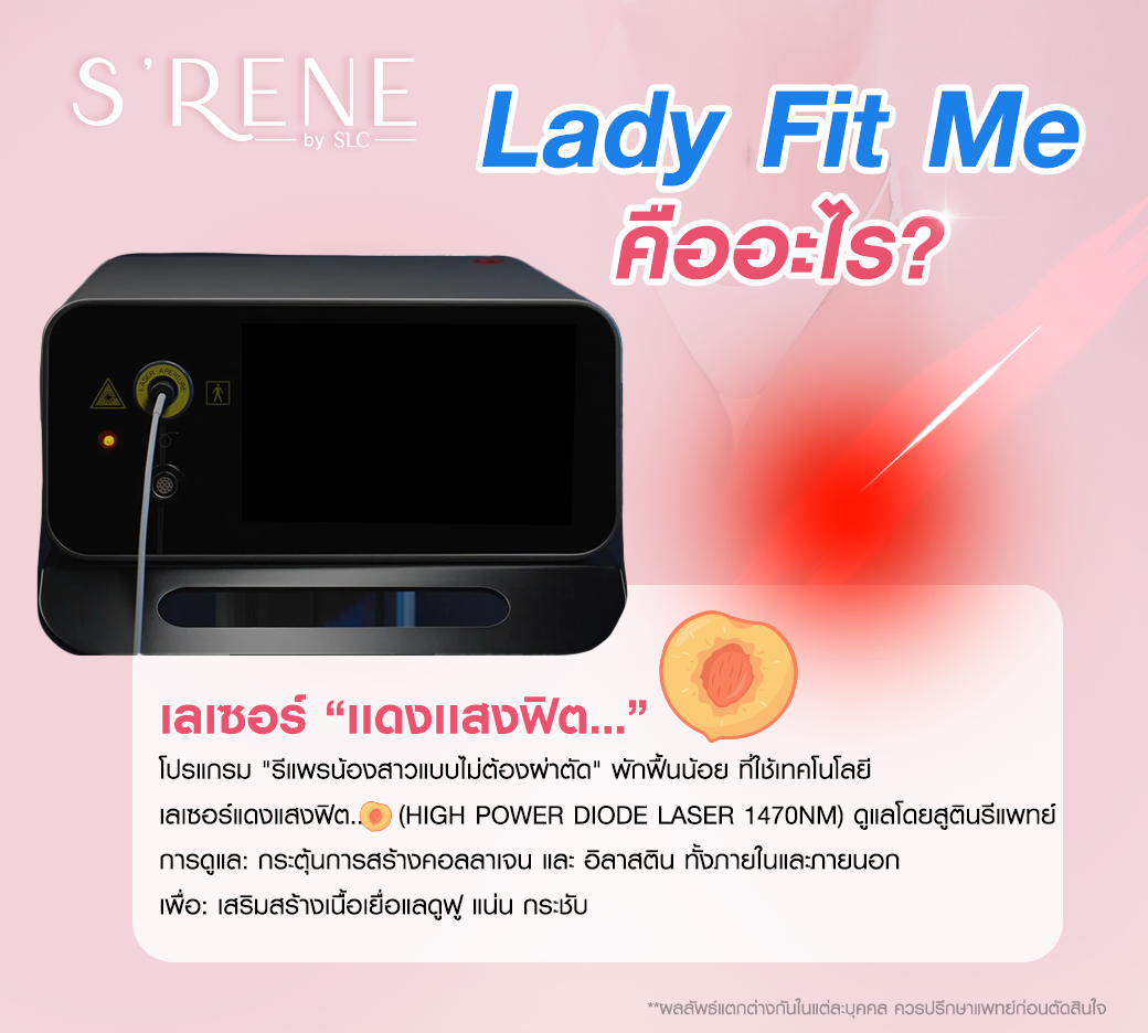 Lady Fit Me™ Program คือ นวัตกรรมเลเซอร์แดงแสงฟิตกระชับช่องคลอดที่ไม่ใช่การผ่าตัด ไม่ต้องลงมีด ไม่ต้องดมยาสลบ เทคนิคนี้จะใช้เทคโนโลยีเลเซอร์ไดโอด (High Power Diode Laser) ความยาวคลื่น 1470nm ซึ่งมีความแม่นยำสูง ตัวเลเซอร์แดงแสงฟิตจะส่งพลังงานลงไปใต้ชั้นผิว เพื่อกระตุ้นให้เซลล์ผิวกลับมาสร้างคอลลาเจน และอิลาสตินใหม่ เปรียบเสมือนเทรนเนอร์ส่วนตัวของเนื้อเยื่อ ที่ทำให้ผนังช่องคลอดและผิวภายนอกรู้สึกกระชับและมีความยืดหยุ่นมากขึ้น