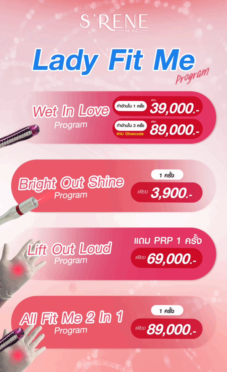 - Lady Fit Me™ Program เลเซอร์แดงแสงฟิตกระชับช่องคลอดตัวนี้จะเน้นดูแลงานผนังช่องคลอด ช่วยฟื้นฟูเนื้อเยื่อภายในช่องคลอดให้กลับมารู้สึกกระชับและยืดหยุ่นขึ้น พร้อมปรับสีผิวให้ภายนอกจุดซ่อนเร้นดูสดใสขึ้น