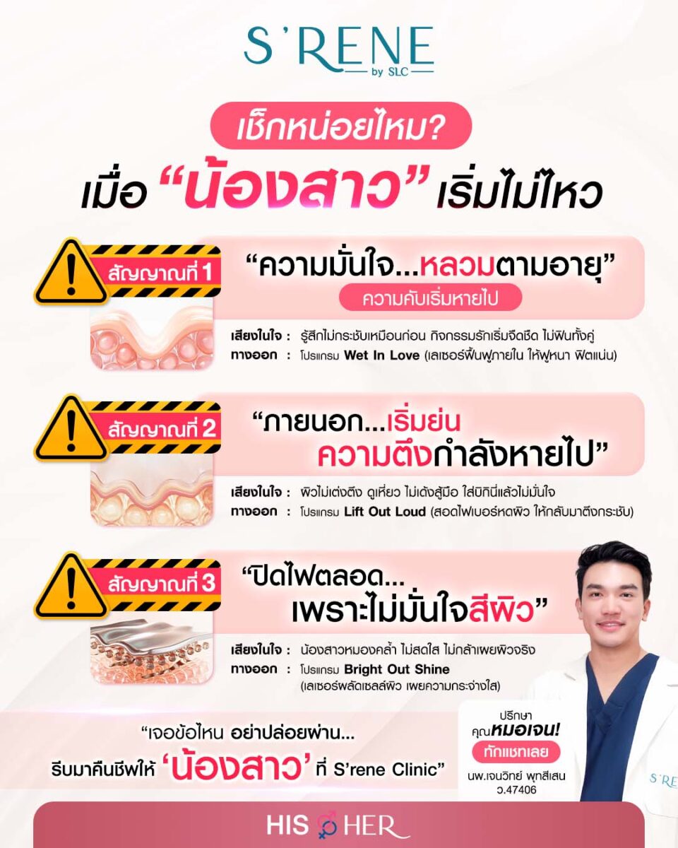 ถ้าปัญหาช่องคลอดแห้ง หรือ ถ้ำหลวม คอยกวนใจซ้ำ ๆ จนทำให้ความมั่นใจหดหายไป หรือทำให้ชีวิตคู่จืดจาง อย่าปล่อยไว้นาน! แวะมาที่ S’RENE by SLC ให้เราช่วยดูแลน้องสาวคุณด้วยโปรแกรม Lady Fit Me™ และ โปรแกรม S’RENE Feminine Care ที่ออกแบบมาเพื่อคุณผู้หญิงโดยเฉพาะ รับรองว่าคุณจะเดินออกจากคลินิกด้วยความรู้สึกใหม่… ได้สัมผัสความฟิตชุ่มฉ่ำและมั่นใจขึ้นกว่าเดิมแน่นอน!