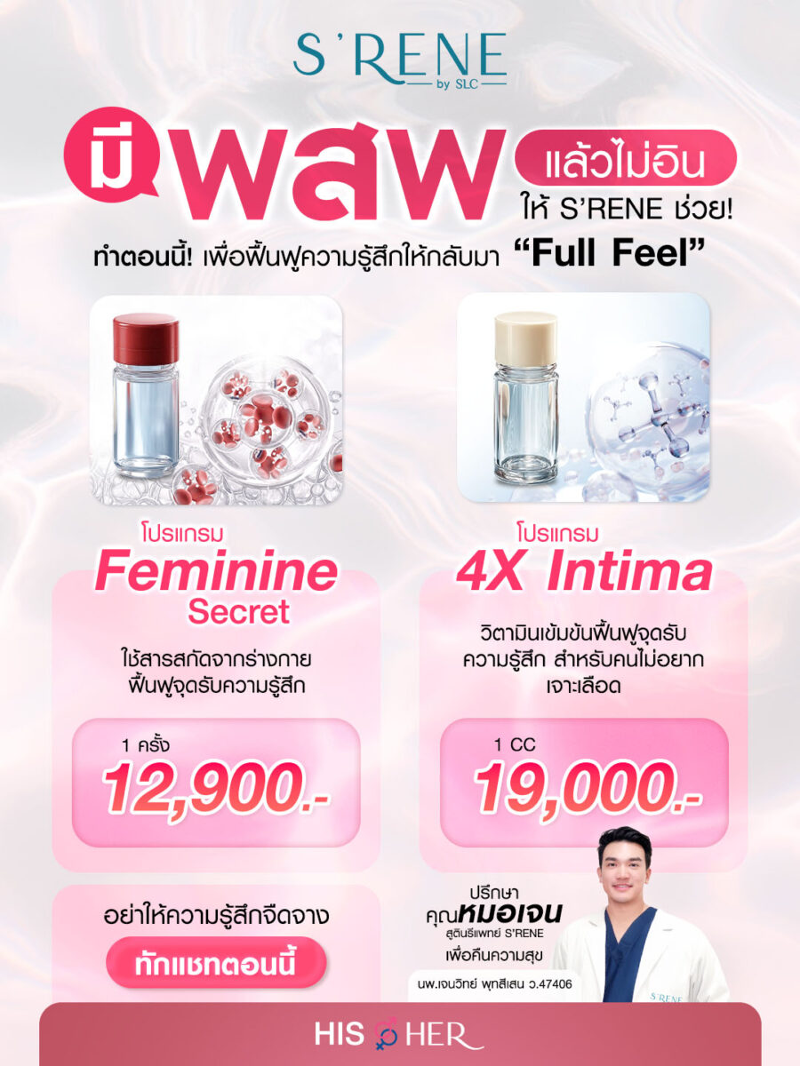 - S’RENE Feminine Inner Care (40 นาที): เน้นภายใน กระชับช่องคลอด เพิ่มความชุ่มชื้น ลดความแห้งฝืด