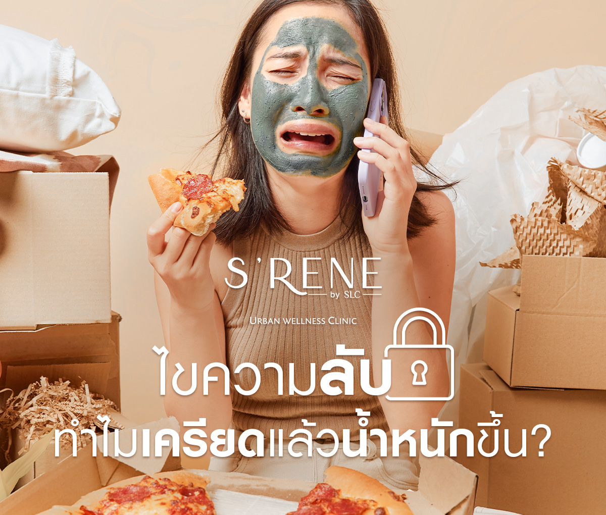 หากรู้สึกว่าความเครียดเกินจะรับมือ ลองพูดคุยกับนักจิตวิทยาหรือแพทย์ที่สามารถแนะนำวิธีจัดการได้อย่างเหมาะสม พูดคุยหรือปรึกษาผู้เชี่ยวชาญด้านสุขภาพ หรือถ้า น้ำหนักขึ้น ลดไม่ลง สามารถเข้าร่วมโปรแกรม Weight Management 1 เดือน และ 3 เดือน ควบคุมน้ำหนักอย่างปลอดภัยและยั่งยืน พร้อมคำแนะนำจากแพทย์เฉพาะทางด้านเวชศาสตร์ป้องกัน กับทาง S’RENE by SLC เพื่อหาทางออกและวางแผนการควบคุมน้ำหนัก ไม่ว่าจะเป็นการตรวจสุขภาพ การใช้ปากกาควบคุมความหิว ที่เป็นตัวช่วยในการปรับพฤติกรรมการกิน และโปรแกรมอื่น ๆ ที่จะร่วมเดินทางสู่รูปร่างที่ใฝ่ฝันไปด้วยกัน