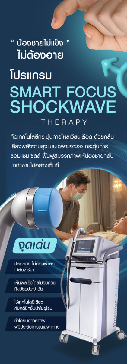 โปรแกรม Smart Focus Shockwave Therapy คือเทคโนโลยีกระตุ้นการไหลเวียนเลือด ด้วยคลื่นเสียงพลังงานสูงแบบเฉพาะเจาะจง กระตุ้นการซ่อมแซมเซลล์ ฟื้นฟูสมรรถภาพให้น้องชายกลับมาทำงานได้อย่างเต็มที่