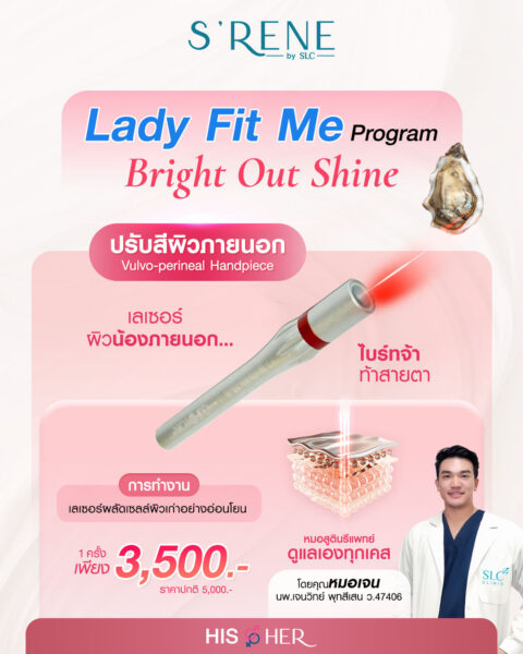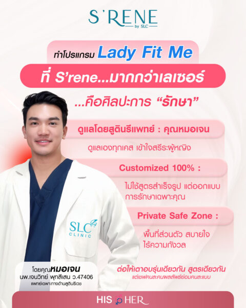 เคยรู้สึกไหม…ว่า “น้องสาว” คนเดิมของเราดูเปลี่ยนไป? อาจเริ่มไม่กระชับเหมือนเก่า แห้งจนขาดความมั่นใจ หรือผิวภายนอกดูไม่สดใสเหมือนตอนแรกแย้ม ไม่ต้องเครียดค่ะ เพราะเรามีตัวช่วยที่ฟื้นฟูความฟิต ความเฟิร์ม และความมั่นใจให้กลับมาอีกครั้ง…โดยไม่ต้องพึ่งการผ่าตัด! S’RENE by SLC ขอแนะนำโปรแกรม เลเซอร์รีแพร Lady Fit Me™ (LadyLift) ที่มาพร้อมนวัตกรรม เลเซอร์ไดโอดพลังงานสูง ออกแบบมาเพื่อดูแลเฉพาะจุด ทั้งภายในและภายนอก กระตุ้นโครงสร้างผิวของน้องสาวให้กลับมากระชับ แข็งแรง ฟู แน่น และแลดูอ่อนเยาว์อีกครั้ง