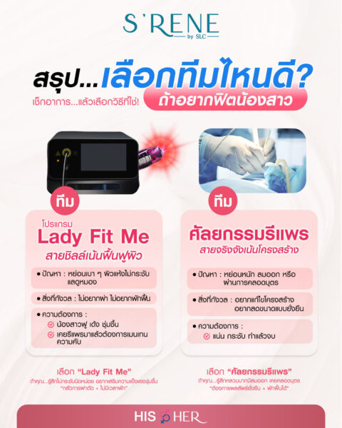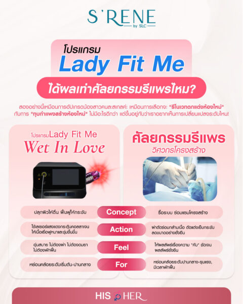 สรุปให้เลยแบบไม่อ้อมค้อมนะคะ  ใครอยากมีน้องสาวที่ฟิต รวมถึงอยากดูแลตัวเองให้มีความมั่นใจและความสัมพันธ์ แบบไม่ต้องผ่าตัด ไม่ต้องพักฟื้นนาน โปรแกรม เลเซอร์รีแพร์ Lady Fit Me™ ของ S’RENE by SLC คือหนึ่งในตัวเลือกที่น่าลองมาก ๆ เพราะมีหลายเทคนิคให้เลือกตามปัญหา ทั้งแบบทำภายนอก ภายใน หรือใช้ไฟเบอร์ใต้ผิว ซึ่งคุณหมอจะช่วยประเมินให้ว่าแบบไหนเหมาะที่สุดกับสภาพของแต่ละคน