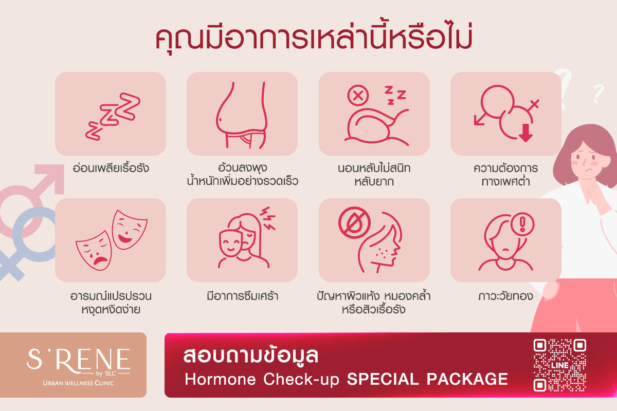 S’RENE by SLC ขอแนะนำโปรโมชั่น Hormone Check Up Special Package! แพ็กเกจตรวจสุขภาพฮอร์โมน โปรแกรมตรวจวัดระดับฮอร์โมนที่จะช่วยให้ทุกคนเข้าใจร่างกายตนเอง พร้อมคำแนะนำเฉพาะบุคคลจากแพทย์เฉพาะทางด้านเวชศาสตร์ป้องกันในการฟื้นฟูและวางแผนสุขภาพ เพื่อหาคำตอบและทางออกที่ใช่สำหรับคุณ