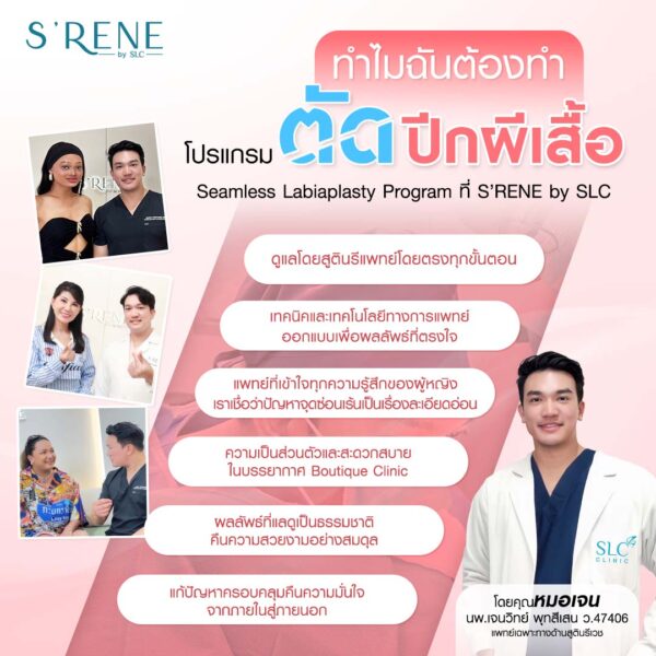 หากสาว ๆ คนไหนกำลังสนใจ อยากลองเข้ามาปรึกษาก่อนที่ซีรีนได้เลย ส่วนใครที่อยากทำ โปรแกรมตัดปีกผีเสื้อ (Seamless Labiaplasty Program) เพื่อทวงคืนทั้งความสุขและความมั่นใจให้กลับมาอีกครั้ง ก็สามารถติดต่อสอบถามข้อมูลเพิ่มเติมหรือจองโปรแกรมได้ที่ S’RENE by SLC คลินิกสุขภาพคนเมือง ที่พร้อมดูแลผู้หญิงทุกคนในแบบที่เข้าใจ